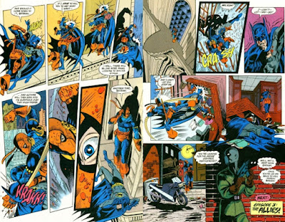 Total Chaos was a big crossover for the Titans in the 90's. Lots of changes happened after it, not only for the Teen Titans, or Team Titans, but for Deathstroke as well. At the end of the crossover, Slade finds himself on Titans Island, tired and overwhelmed by an army. He manages to fight and kill them all, however, he dies soon after. A heart attack. Total Chaos also marks Rose Wilson's first appearance.